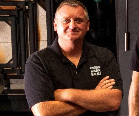After spending eight years working in a private studios, Kennard began his tenure at the Corning Museum in 2001 by teaching beginning and intermediate classes in glassblowing as an instructor in the studio. His work at the museum has since expanded to begin part of the Hot Glass Team, where he assist glassmaking demonstration’s both onsite and abroad through the Mobile Hot Shop.